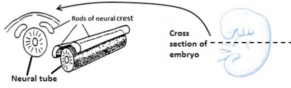 In Week 3 of development the neural plate folded inward to form a neural groove and two neural folds. The tips of the neural folds are made up of specialized nervous tissue called neural crest. Neural folds fuse and detach from the surface, forming a hollow neural tube. As the neural tube is forming, the two clumps of neural crest become detached, forming discrete bars of nervous tissue along the dorsolateral aspect of the neural tube. See Figure 3.1.