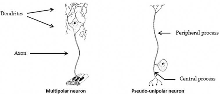 Neurons in the PNS that carry sensory information (touch, pain, etc.) to the CNS have a single short process that subsequently divides into two longer branches—the peripheral process and the central process. Since they appear to have only one process, but really have two, they are known as pseudo-unipolar neurons.