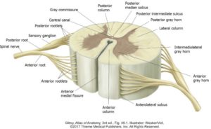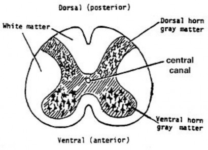 The white matter in the CNS contains axons of neurons wrapped by myelin (a lipoprotein that insulates axons and speeds up the propagation of impulses). Myelin is a fatty substance so it appears white in unstained tissue. A cross-section of the spinal cord shows the gray matter core arranged like the letter “H,” surrounded by white matter. The gray matter is organized into two posterior (dorsal) horns and two anterior (ventral) horns. See Figure 3.4.