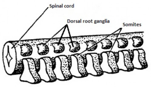 Recall that somites are segmented blocks of paraxial mesoderm. Somites are located adjacent to the developing neural tube. As somites are formed, the neural crest also segments into a row of dorsal root ganglia (Figure 3.6). 31 ganglia are formed and they become associated with 31 of the somites.