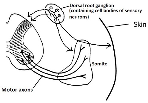 Groups of axons of motor neurons grow out from the ventral horns of gray in the spinal cord and invade the somite closest to their origin. Similarly, the cell bodies of sensory neurons in the dorsal root ganglia sprout processes: the peripheral process grows into the somite as well as the overlying skin. The central processes of sensory neurons grow into the spinal cord where they will synapse with neurons in the dorsal horns of gray in the cord. See Figure 3.7.