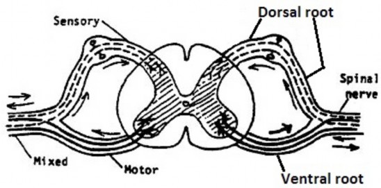 The ventral root conducts impulses away from the spinal cord—it is entirely motor in function. The dorsal root conducts impulses toward the spinal cord—it is entirelysensory. The spinal nerve contains both sensory AND motor fibers—it is mixed.