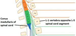 Have a look at Figures 3.11 and 3.12. Note that a crushing injury of the vertebral column at the level of L-1 vertebra would most likely NOT damage the L-1 segment of the spinal cord—instead L-1 vertebra is roughly at the level of the L-5 spinal cord segment. The sacral segments in the spinal cord are contained within the tapered inferior part of the cord (the conus medullaris).