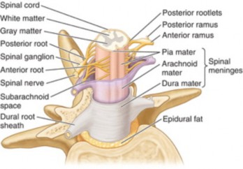 The pia mater (Latin = “tender mother”) is a delicate layer of loose connective tissue that snuggly invests the spinal cord, rootlets, and roots. Small blood vessels that supply the spinal cord and spinal nerve roots course within the pia.