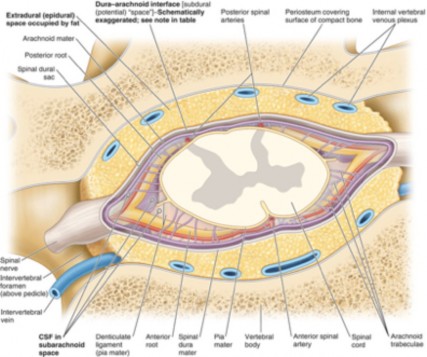 The thecal sac is separated from the bony walls of the vertebral canal by the epidural space. This space extends from the skull base above to the sacral hiatus below. The epidural space contains loose connective tissue, fat, and a large plexus of veins, the internal vertebral venous plexus.