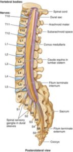 Realize however, that lumbar, sacral, and coccygeal spinal nerves DO exit the vertebral column through an opening below their corresponding vertebrae. This means that the dorsal and ventral rootsthat form these spinal nerves are LONG—in order to reach their appropriate vertebral level below. See Figure 3.11.