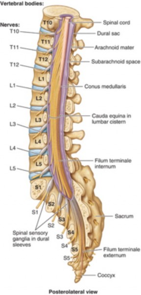 The long dorsal and ventral roots of lumbar, sacral, and coccygeal spinal nerves are gathered together in a bushy structure within the vertebral canal (below vertebra L-1) that resembles a “horse’s tail”—thus it is given the name cauda equina. Below vertebra L-1, there is NO spinal cord—instead, there is a cauda equina.