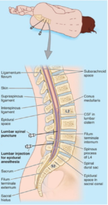 To make the spaces between vertebrae even wider, the patient is asked to bend forward while sitting down or lying on their side. The needle is placed in the back between vertebrae typically in the midline. The resistance offered by ligaments (such as the interspinous ligament or ligamentum flavum) and the subsequent “giving way” when the needle penetrates them informs the clinician that the needle tip has passed into the epidural space. From here the needle is advanced through the thecal sac into the subarachnoid space.