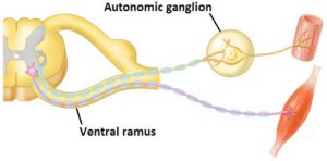The primary feature that distinguishes the autonomic NS from the somatic system is the presence of ganglia in the pathway. These autonomic ganglia are motor ganglia—something we have not encountered before in our discussions on the peripheral nervous system.