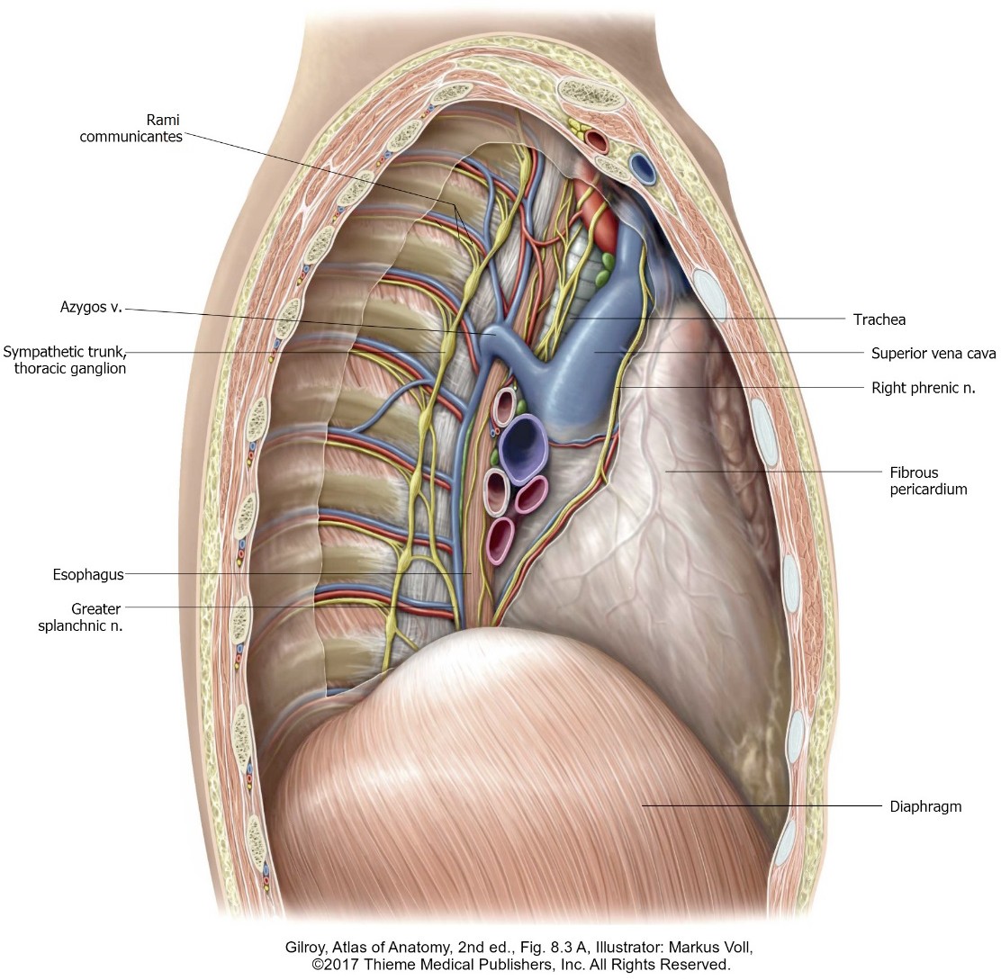 Preganglionic sympathetic fibers that supply thoracic organs synapse in paravertebral ganglia. Postganglionic fibers reach thoracic organs via visceral branches.