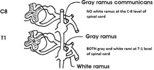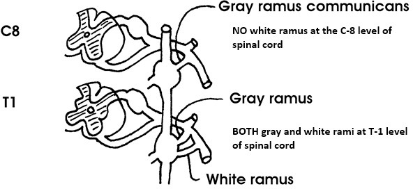 Preganglionic cell bodies of sympathetic neurons that supply somatic regions are located in the intermediolateral cell column of spinal cord segments T-1 to L-2. Axons leave T-1 to L-2 spinal cord segments through ventral roots, pass through spinal nerves and ventral rami, and enter the corresponding T-1 to L-2 paravertebral ganglia through white rami communicantes. Since these first neurons in the pathway supply all parts of the body, from head to toe, some fibers ascend or descend in the sympathetic trunk to reach their target levels in the body – kind of like an elevator ride.