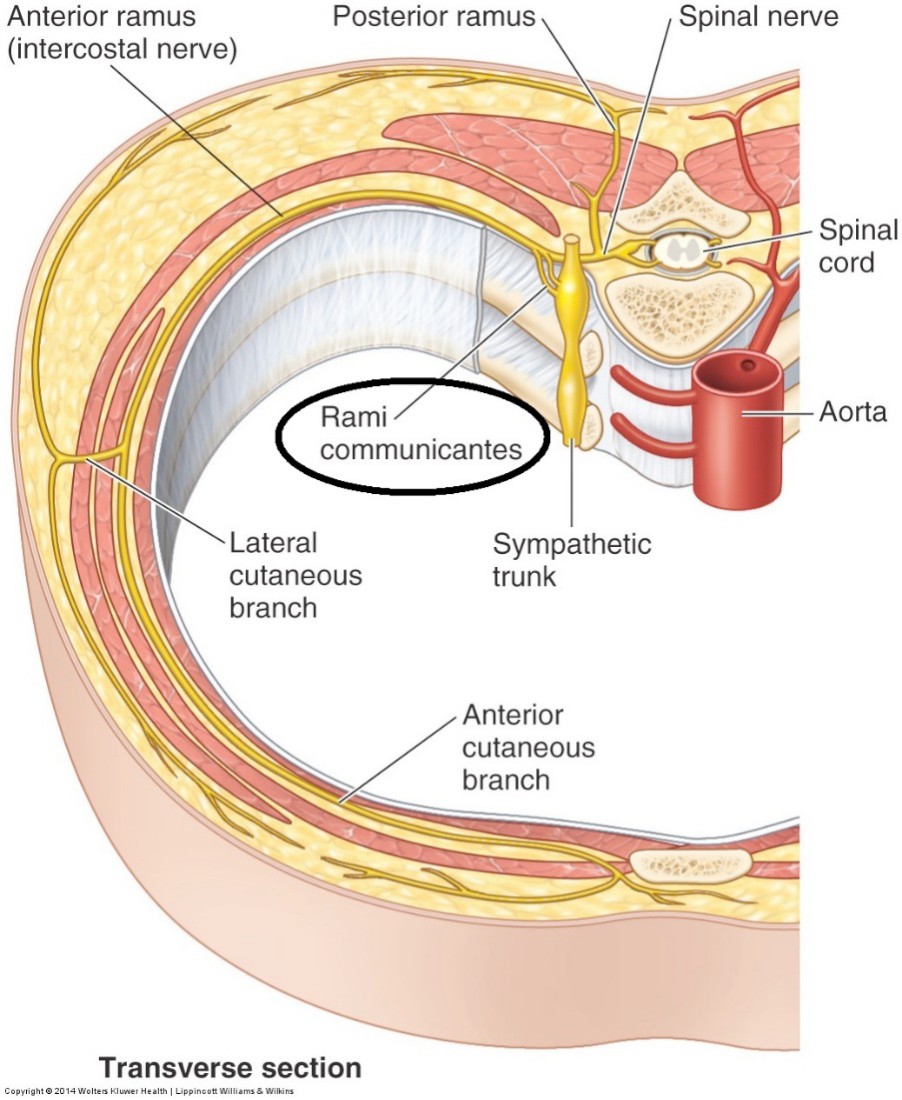 Each sympathetic chain ganglion has at least one branch that connects the ganglion to a corresponding ventral ramus of a spinal nerve. This branch transmits postganglionic sympathetic fibers from the chain ganglion to the spinal nerve. Since postganglionic fibers are non-myelinated (do not look white), this branch is called the gray ramus communicans.