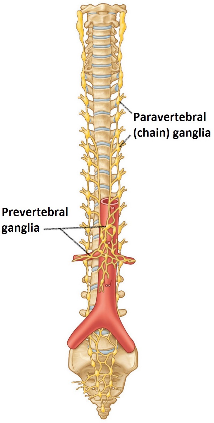 Similar to dorsal root ganglia, paravertebral ganglia (left and right) originally developed for each somite of the body. Thus, there were 31 pairs of paravertebral ganglia. Fusion of ganglia occurs in the cervical and lumbar regions, so in the adult there are fewer than 31. Paravertebral ganglia are connected vertically by interganglionic branches, forming a chain of ganglia on each side of the vertebral column. This is called the sympathetic trunk. Paravertebral ganglia are also known as sympathetic chain ganglia. Thesympathetic trunks extend from the base ofthe skull all the way to the coccyx.