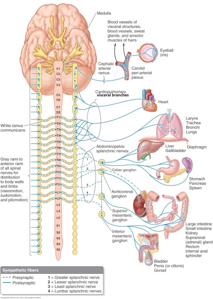 Figure 4.9 Summary diagram of sympathetic division of the ANS. MOORE ET AL., CLINICALLY ORIENTED ANATOMY, FIGURE I.46.