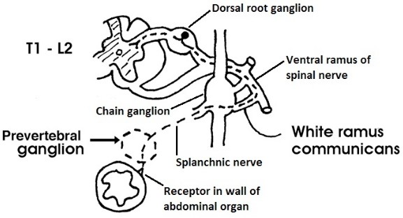 Pain from most organs in the thoracic and abdominopelvic cavities flows to the spinal cord alongsympathetic pathways, but in a reverse direction. The peripheral processes (axons) of the visceral sensory neurons pass to sympathetic chain ganglia through splanchnic nervesand visceral branches, then through white rami communicantes to spinal nerves. The cell bodies of these sensory neurons are in the dorsal root ganglia associated with T-1 to L-2 spinal nerves. Note that since this is a sensory pathway (not an autonomic motor pathway),there is only one neuron involved, not two. There is no synapse within prevertebral or chain ganglia—the sensory fibers are only passin’ through.