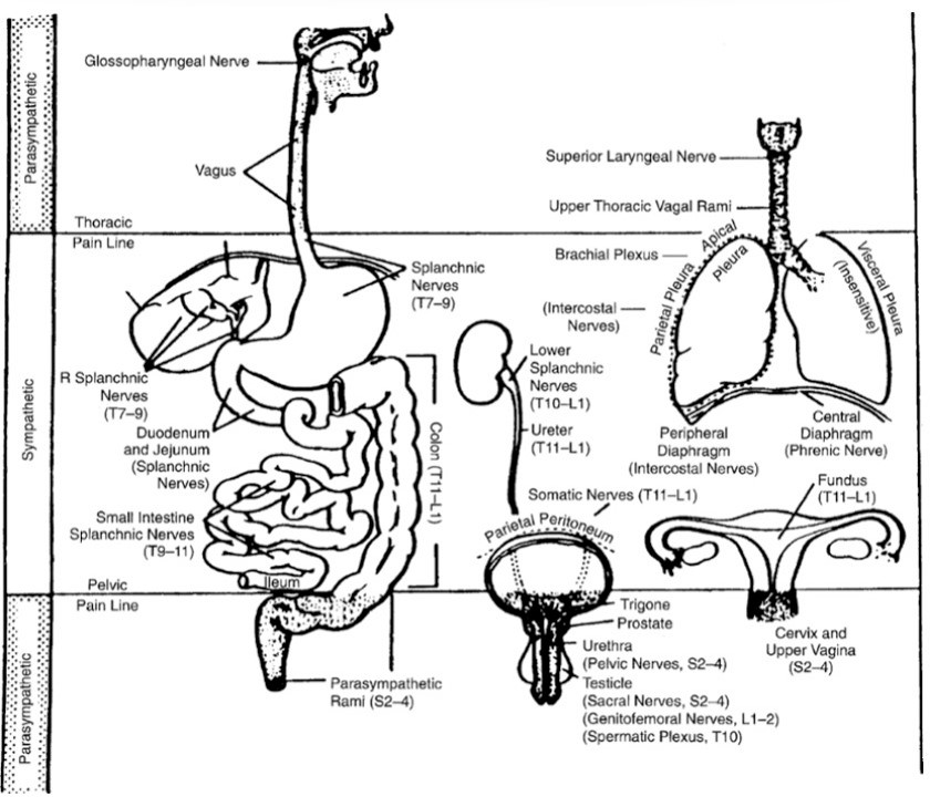 Figure 4.11 “Pain lines” demarcating the ANS divisions that organ pain pathways accompany.