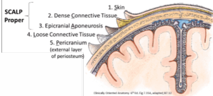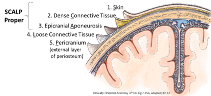 The scalp covers the skull and extends from the supraorbital margins anteriorly to the nuchal lines posteriorly, and laterally to the zygomatic arches. The skin, connective tissue, and aponeurosis (SCA, layers 1–3 below) make up the scalp proper and are clinically considered one layer that are reflected together during a craniotomy, or when part of the scalp is torn off in an injury. From superficial to deep, the layers of the scalp are: