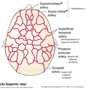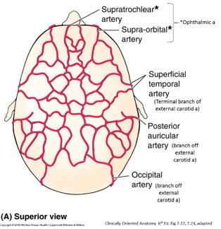 Aponeurosis: When it is cut, the occipitofrontalis holds the wound open so lacerated arteries can’t retract. This is one of the reasons that scalp wounds bleed profusely. Superficial lacerations that do not extend to the aponeurosis are easily closed.