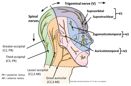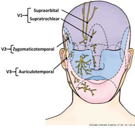 Supraorbital (V1), Supratrochlear (V1), Zygomaticotemporal (V2), and Auriculotemporal (V3)