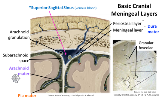 Functions: Protection; blood vessel scaffolding; formation of venous sinuses; and formation of the continuous sac called the subarachnoid space (located between the arachnoid mater and pia mater), for the flow of cerebrospinal fluid.