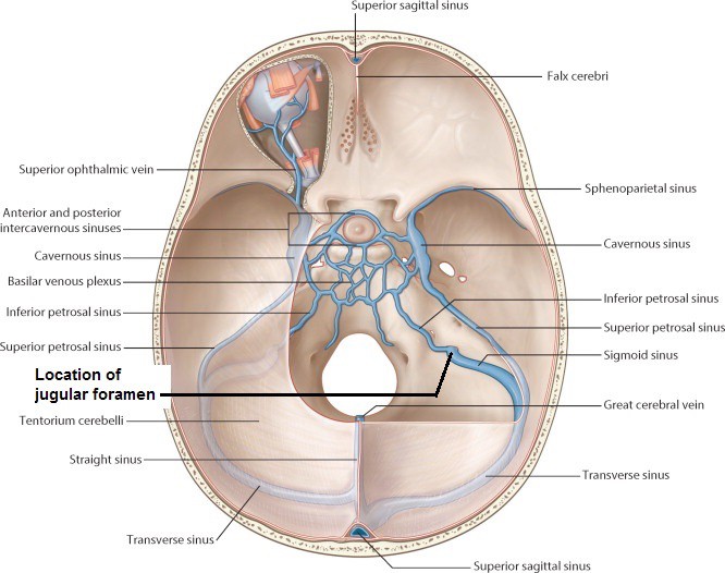 Jugular foramina: all dural venous sinuses drain here, where the internal jugular veins begin