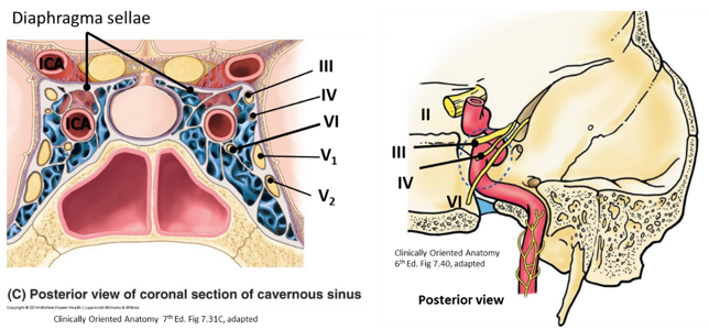 Cranial nerves III, IV, V1, and V2are the lateral wall of the cavernous sinus. Cranial nerve VI is in the center of the cavernous sinus, bathed by venous blood!