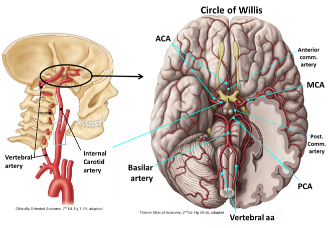 Internal carotid (ICA) and vertebral arteries: Two pairs of arteries supplying the brain itself.