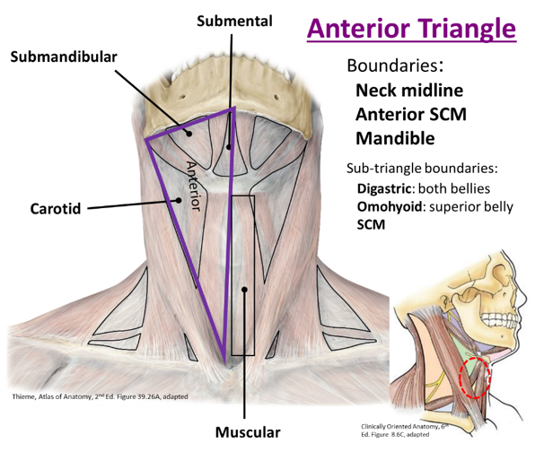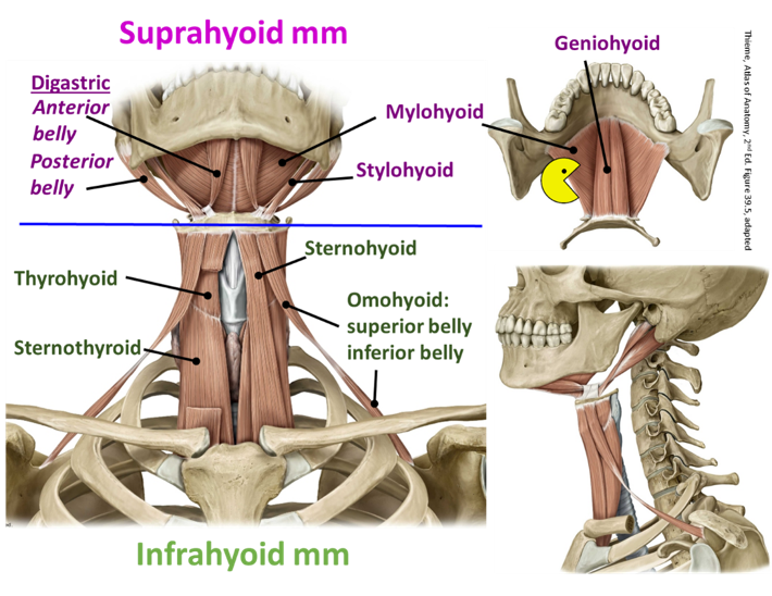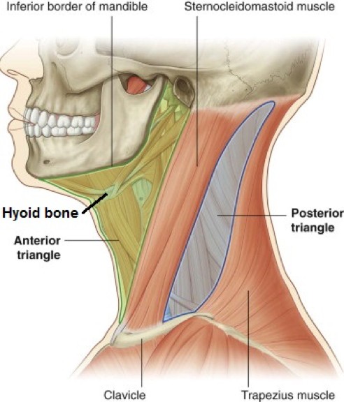 Recall the hyoid lies in the anterior triangle opposite C3. The anterior triangle above and below the hyoid bone are often called suprahyoid and infrahyoid regions, respectively.