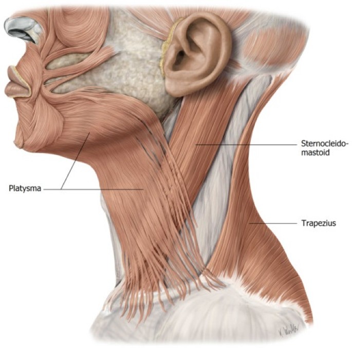 Platysma muscles: Thin grimace muscles; these are muscles of facial expression that blend with other facial muscles near the corners of the mouth.