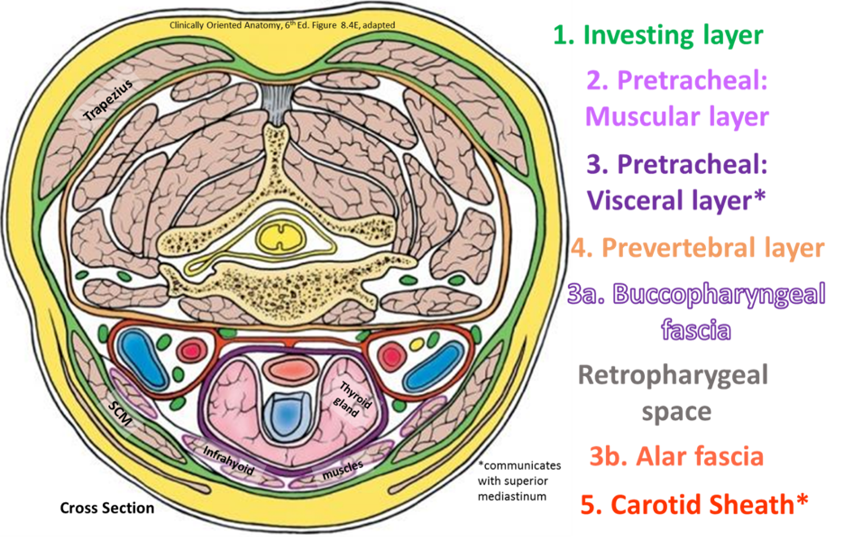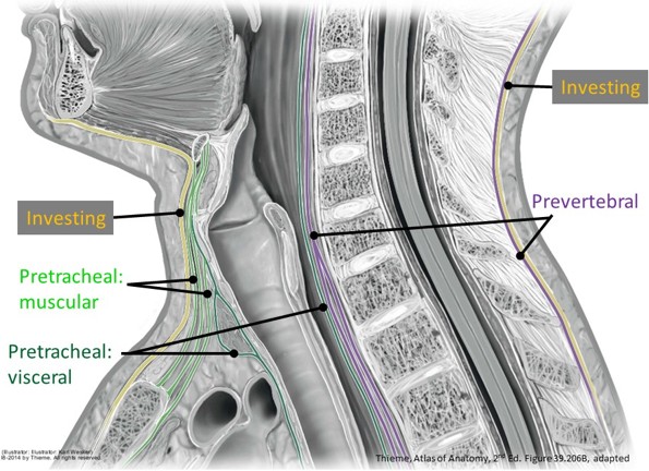 Visceral part: Surrounds the thyroid gland, trachea, and esophagus. This layer extends upwards to surround the pharynx, where it is called buccopharyngeal fascia.