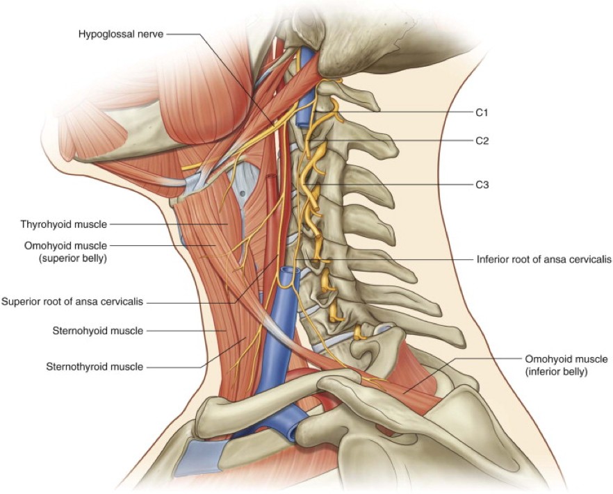 Thyrohyoid (C1fibers, by hitching a ride on CN XII): Runs superiorly from the thyroid cartilage to the hyoid