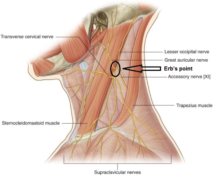 All the sensory branches of the cervical plexus emerge from the deep neck and pass into the superficial fascia at a common location. This is Erb's point, located along the posterior border of the sternocleidomastoid, halfway between the mastoid process and the clavicle. Complete anaesthesia of the superficial neck can be obtained by injecting an anesthetic at Erb's point.