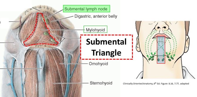 Submandibular lymph nodes: receive lymph from the tongue and the oral cavity. Lesions in the mouth (like “canker” sores) can cause their inflammation (lymphadenopathy) and make them tender.