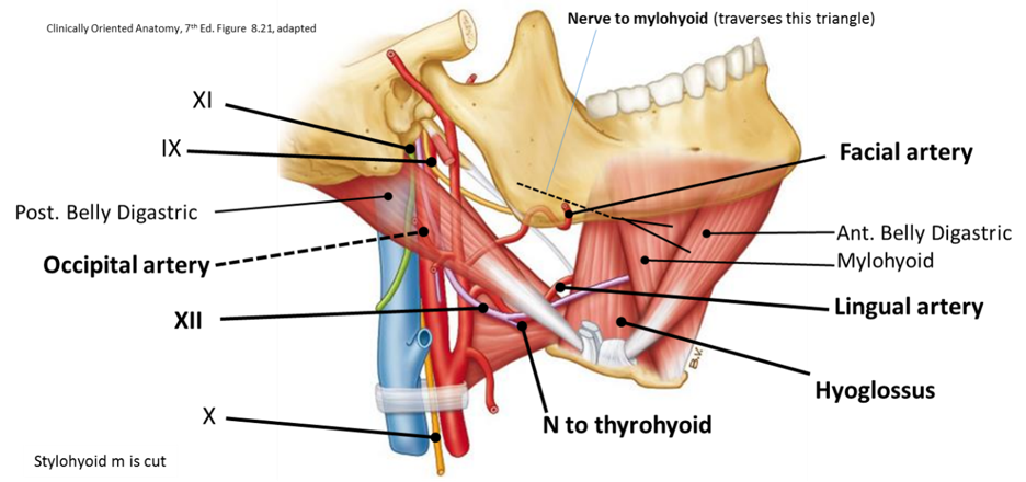 Cranial nerve XII: occipital artery twists around it; passes between mylohyoid and hyoglossus muscles
