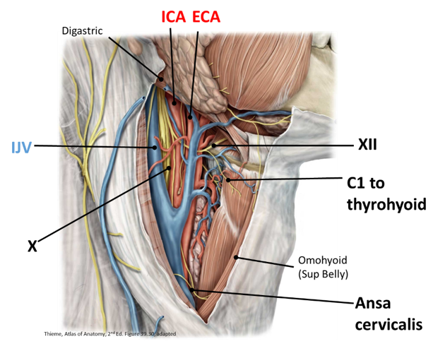 Common Carotid Artery (CCA): Ascends and bifurcates at ~C-4 (superior border of the thyroid cartilage) into the internal carotid and external carotid arteries