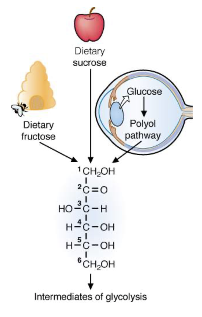 The sugar fructose is found in the diet as the free sugar in foods such as honey or as a component of the disaccharide sucrose in fruits and sweets. It also can be synthesized from glucose via the polyol pathway. In the lens of the eye, the polyol pathway contributes to the formation of cataracts. Fructose is metabolized by conversion to intermediates of glycolysis.