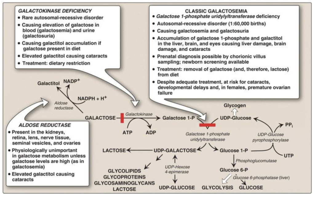 Aldose reductase is found in many tissues, including the retina and lens. It reduces glucose, producing sorbitol. This is known as the polyol pathway, which consists of converting glucose to sorbitol via aldose reductase and then converting sorbitol to fructose via sorbitol dehydrogenase. With hyperglycemia, sorbitol can be “trapped” in tissues. In a previous class, we discussed lactose metabolism. The chapter goes into it a bit more, but it’s not that high yield.