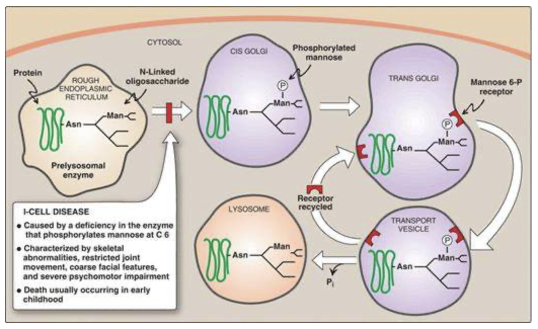 A high-yield disease to know that is related to glycoproteins is I-cell disease. This disease results from a defect in the addition of the mannose 6-phosphate tag on enzymes destined for the lysosome (see the figure below). As such, these hydrolytic enzymes end up being secreted from the cell. Substrates within lysosomes accumulate, resulting in large inclusion bodies, hence I-cells. Patients have skeletal abnormalities, joint impairment, coarse facial features, and psychomotor impairment culminating in death by the age of 8 years.