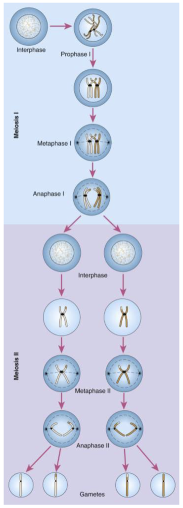 A single chromosome pair and a single crossover are shown, leading to formation of four distinct gametes. The chromosomes replicate during interphase and begin to condense as the cell enters prophase of meiosis I. In meiosis I, the chromosomes synapse and recombine. A crossover is visible as the homologues align at metaphase I, with the centromeres oriented toward opposite poles. In anaphase I, the exchange of DNA between the homologues is apparent as the chromosomes are pulled to opposite poles. After completion of meiosis I and cytokinesis, meiosis II proceeds with a mitosis-like division. The sister kinetochores separate and move to opposite poles in anaphase II, yielding four haploid products.