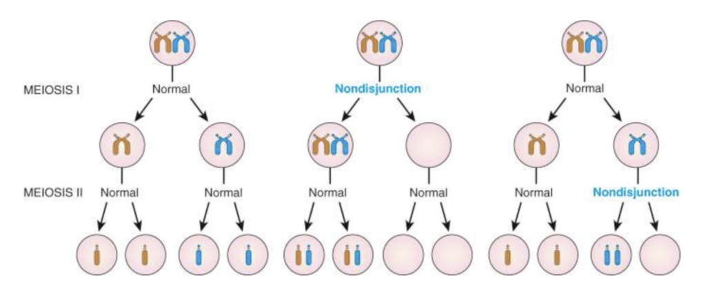 The different consequences of nondisjunction at meiosis I ( center ) and meiosis II ( right ) , compared with normal disjunction ( left ). If the error occurs at meiosis I, the gametes either contain a representative of both members of the chromosome 21 pair or lack a chromosome 21 altogether. If nondisjunction occurs at meiosis II, the abnormal gametes contain two copies of one parental chromosome 21 (and no copy of the other) or lack a chromosome 21. Figure and text taken from: Nussbaum RL, McInnes RR, Willard HF. Thompson & Thompson Genetics in Medicine. Eighth ed. Philadelphia: Elsevier; 2016