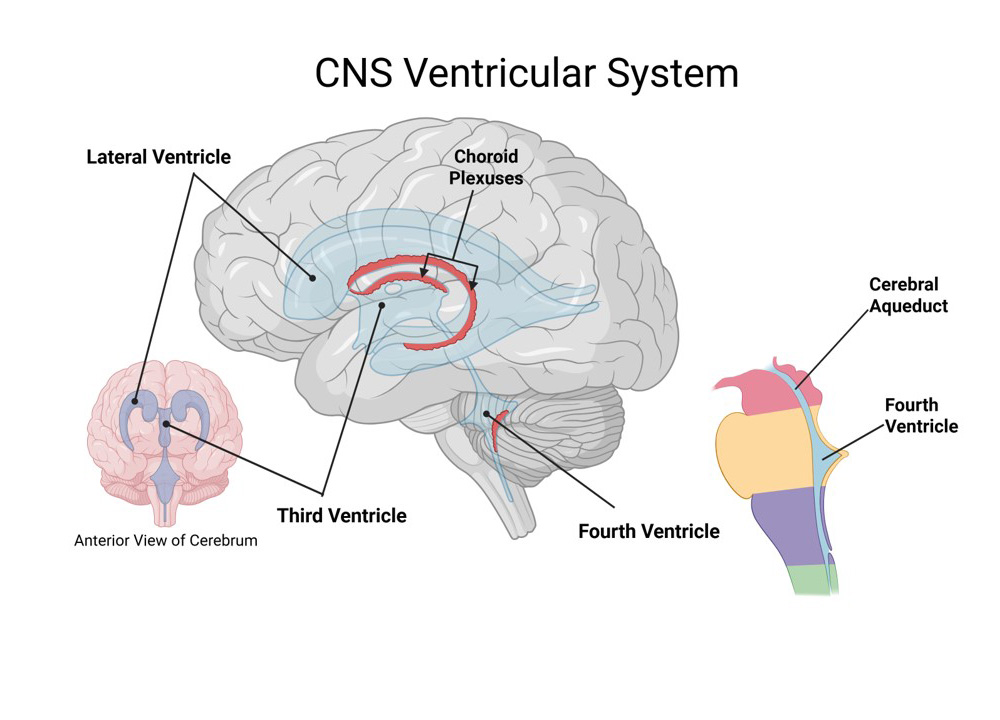 CSF is produced in all of the ventricles by choroid plexuses (w/ a total volume of ~25 ml in all the ventricles); the MRI in Figure 6 indicates the direction of flow of cerebrospinal fluid between the ventricles.