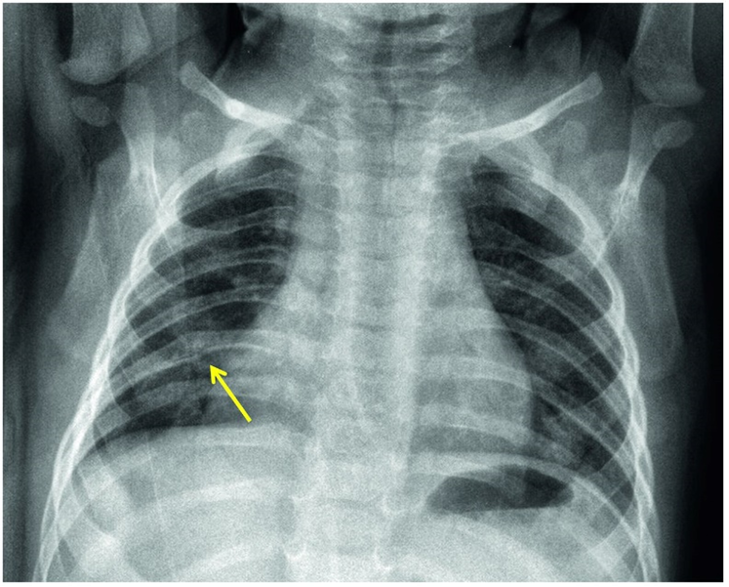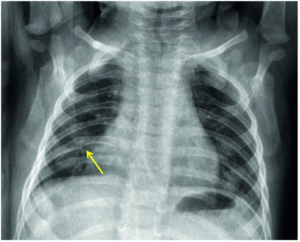 The diagnosis of bronchiolitis is clinical (based on the patient’s history and physical examination). Laboratory testing and radiographic studies are not recommended for diagnosis. CBC, inflammatory markers, blood culture, and chest x-ray should only be used when a serious bacterial infection (SBI) is suspected. A viral respiratory panel may be used to aid in the more accurate diagnosis of the viral pathogen, which may be useful for the hospitalized patient or in patients not following the expected course of illness. A chest x-ray may be performed to rule out conditions like effusions or pneumothorax when there is clinical suspicion but should not be used to evaluate for pneumonia as that is a clinical diagnosis. In bronchiolitis, the chest x-ray may show hyperinflation of the lungs, atelectasis, or peribronchial cuffing that is often referred to as the classic cheerio (see CXR).