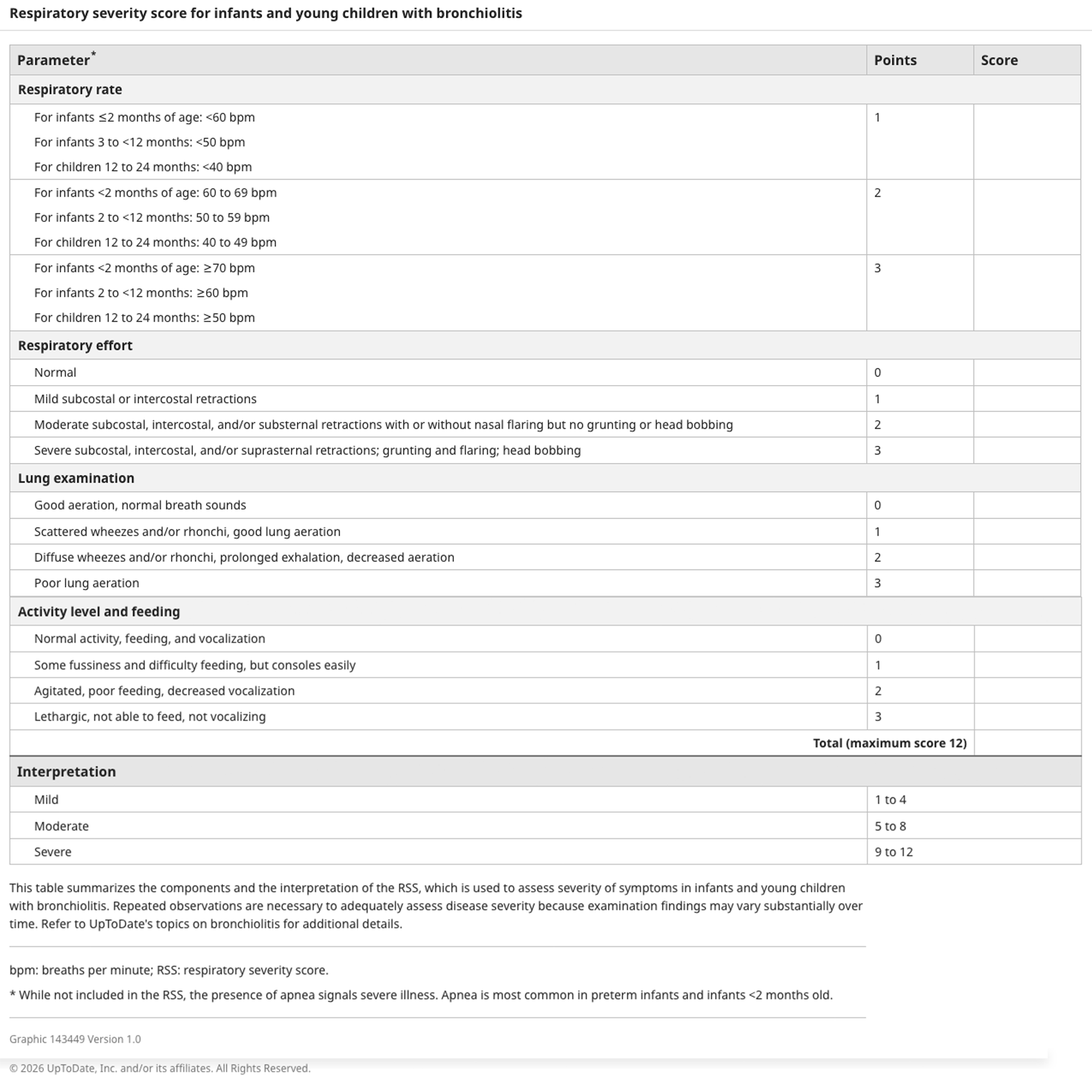 There are multiple ways to score severity of respiratory distress in the setting of bronchiolitis, which in turns aids in informing how aggressive clinical management should be and whether hospitalization should be considered. Most large Children’s Hospitals have internal scoring systems; however, they often include the following consistent variables: Respiratory rate based on age, work of breathing, mental status, oxygen requirement, and breath sounds.